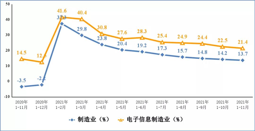 IT之家12月31日消息,今日工信部發布了2021年1月—11月份電子信息制造業運行情況。報告顯示,11月份,規模以上電子信息制造業增加值同比增長13.5%,增速比上年同期提高4.2個百分點。