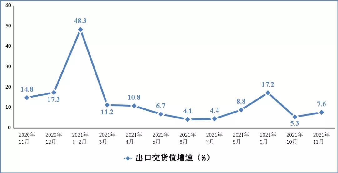 11月份,規模以上電子信息制造業實現出口交貨值同比增長7.6%,增速比上月回升2.3個百分點。1—11月份,規模以上電子信息制造業累計實現出口交貨值同比增長12.6%