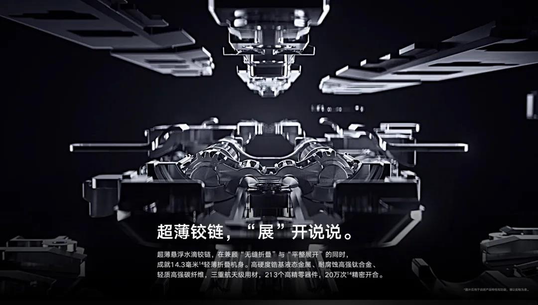 鉸鏈上則采用了自研超薄懸浮水滴鉸鏈,手機合起來厚度為14.3mm,展開形態兩側均為6.7mm,支持20萬次的開合。