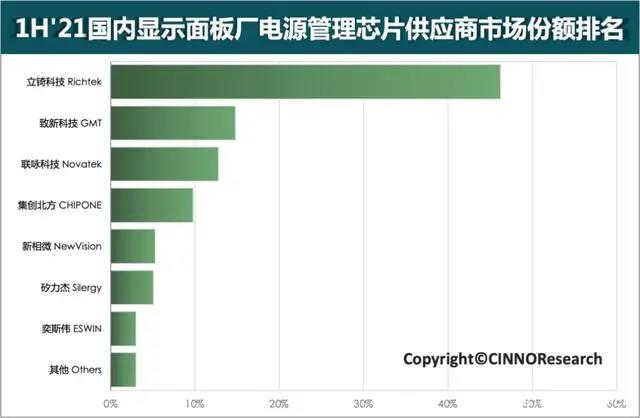 圖示:1H'21國內(nèi)顯示面板廠電源管理芯片供應(yīng)商市場份額排名,來源:CINNO Research