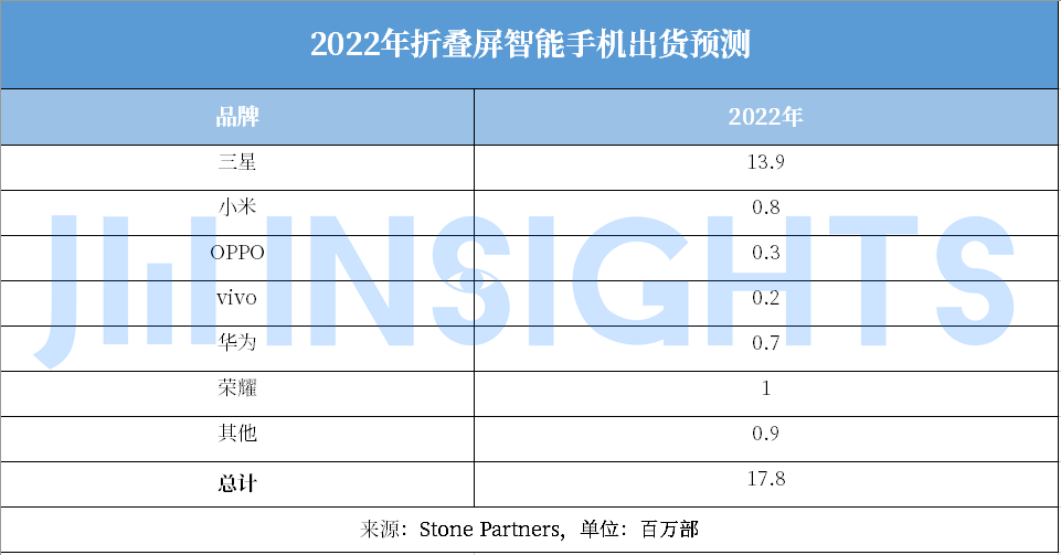 國內小米也推出了 MIX FOLD,起售價 9999 元,而且在不同節點持續降價,也讓部分消費者開始嘗鮮折疊屏手機。Stone Partners數據顯示,2021 年小米 MIX FOLD出貨量達到 50 萬部。華為受芯片禁令影響,折疊屏手機推進受阻,2021 年出貨量 30 萬部。