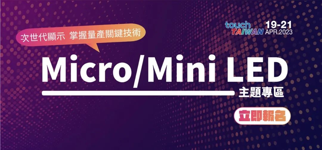 2022 Touch Taiwan展覽上,“Micro & Mini LED專區(qū)”有富采控股領(lǐng)軍旗下公司晶元光電、隆達(dá)電子、晶成半導(dǎo)體、元豐新科技及葳天科技共同展出,其他重量級參展商包括镎創(chuàng)科技、漢民科技、達(dá)運(yùn)精密、達(dá)興材料、聚積、東捷、錸寶、晶彩、Toray Engineering、Kulicke & Soffa以及ASM Pacific,首度參展亮相的有斯托克精密、Coherent、PORO TECH及法國新創(chuàng)公司Aledia,大秀Micro/Mini LED商機(jī)。