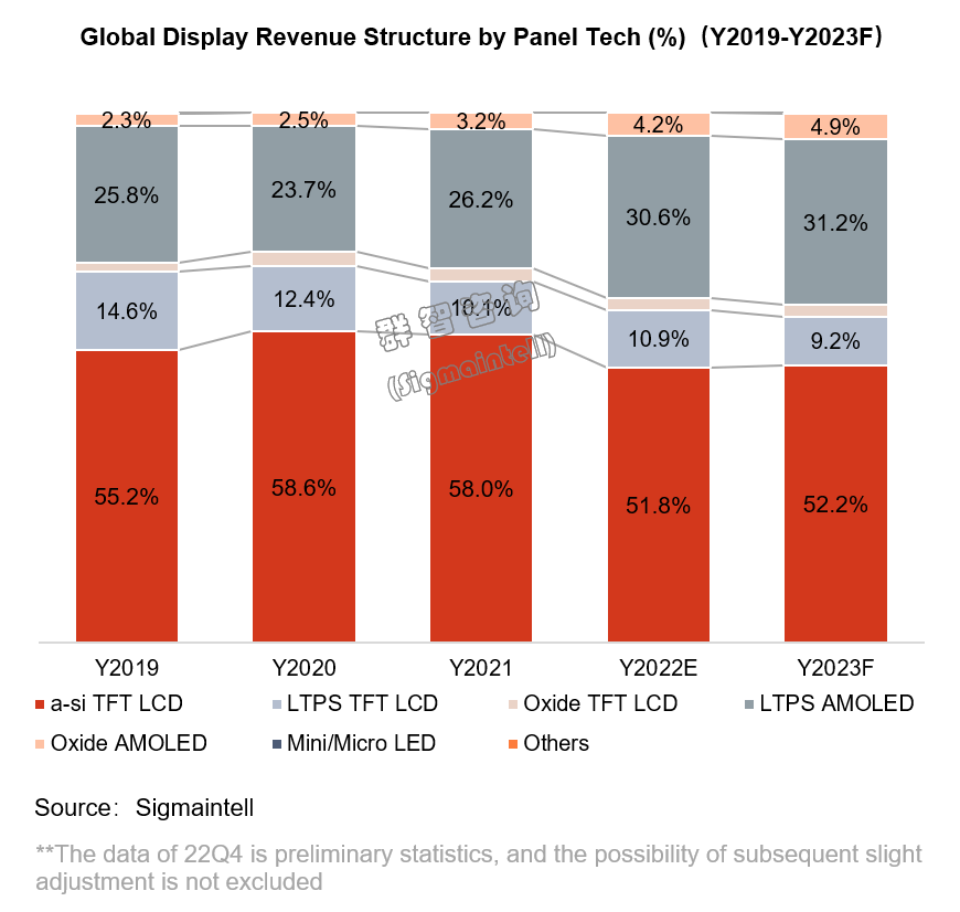 隨著柔性OLED在高端智能手機市場上的普及,以及剛性OLED在中低端智能手機市場的轉移,LTPS LCD面板持續受到來自OLED面板的擠壓。LTPS LCD面板廠商中,日系廠商在智能手機中高端市場逐漸喪失競爭優勢,逐漸將產能向車載市場轉移;而臺系面板廠也逐漸面臨相同困境,產能向筆電市場和車載市場擴展;而中國大陸面板廠商在OLED面板競爭下,LTPS LCD產能也都開始往中尺寸應用轉移。然而2022年,筆電市場的蕭條,以及車載市場的增長無法彌補智能手機市場失去的份額,LTPS LCD面板營收份額持續下滑。根據群智咨詢(Sigmaintell)初步統計,2022年全球LTPS LCD面板營收規模約為110億美金,同比下降約22%。預計2023年將持續受到OLED面板帶來的沖擊,整體營收將呈現持續大幅下降趨勢。