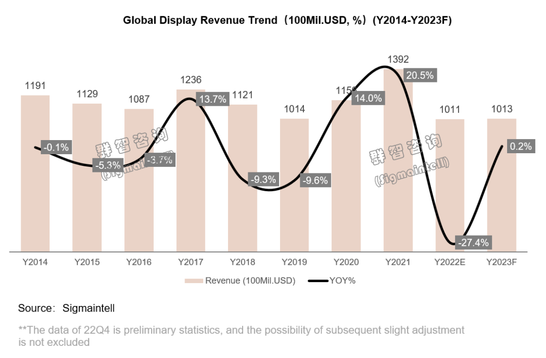 進入2023年,全球經濟仍處于后疫情期中的弱經濟周期中,疫情影響依然存在,通脹高企、全球性問題持續,世界經濟復蘇信號偏弱,2023年世界經濟復蘇面臨較大壓力,經濟形勢謹慎看待。預計2023年消費電子需求將在低位修復性恢復,而新型顯示面板行業在去庫存、稼動率下調等多重主動策略措施下,產值也將有機會呈現小幅提升,群智咨詢(Sigmaintell)初步預測,2023年全球新型顯示面板產值將達到1013億美元,同比呈現微幅增長趨勢。