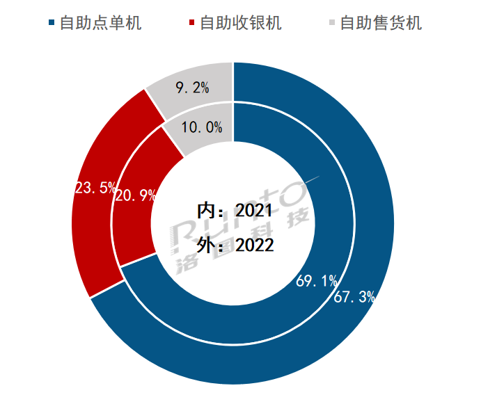 本文主要聚焦于消費零售類產品,包含自助點單機、自助收銀機、自助售貨機。根據洛圖科技(RUNTO)數據顯示,2022年,自助點單機出貨量占比67.3%,自助售貨機占比9.2%;自助收銀機占比23.5%,是絕對出貨量和內部份額唯一增長的品類,在整體自助設備的占比中增長了2.6個百分點。