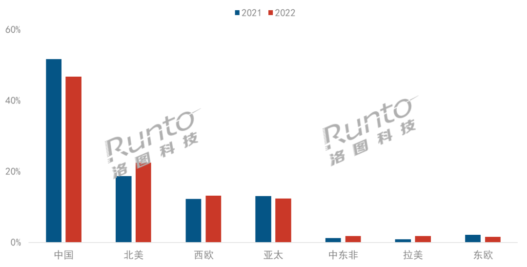 同期,北美市場份額增長至23%,保持全球第二大市場的地位;西歐地區在2022年度超過亞太地區,成為第三大市場,占比達到13%;中東非和拉美地區實現增長,均占據約2%的市場份額。2021-2022年全球激光投影分區域出貨量結構