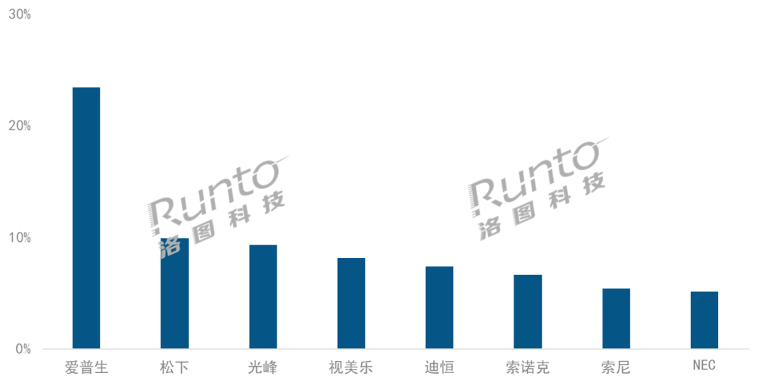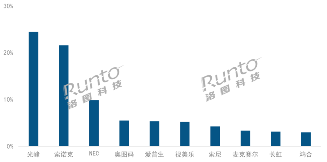 雖然日系品牌在行業地位逐步消退,但愛普生在工程市場以23%的市場份額保持了優勢,位居第一。光峰、視美樂、索諾克等本土品牌加速產品布局和場景創新,在量和質兩個維度上表現出強大競爭力,呈現不同程度的增長。