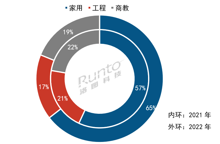 中國大陸市場:家用快速增長,工程商教下滑明顯聚焦到中國大陸市場,2022年,家庭顯示需求的大屏化和多場景化帶動家用市場份額攀升至65%,增長8個百分點。市場詳情可以參考早前發布的《年報 | 2022年中國大陸家用激光投影市場總結與展望》。工程市場受到疫情因素的壓制,全年銷售不理想,出貨量份額下滑至17%。商教市場出貨量同比下滑4.7%,份額下降至19%。但是,智能應用系統的搭載率不斷提升,以及產品的輕量化和便攜性拓寬了激光商務投影應用的寬度,商務投影出貨量實現29%的增長。