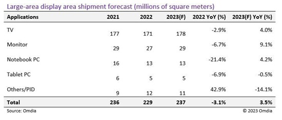 據(jù)產(chǎn)業(yè)研調(diào)機構Omdia 報告指出,盡管全球經(jīng)濟不景氣,2023 年大尺寸顯示器面板出貨量仍可望較2022 年成長0.8%,出貨面積年增3.5%。