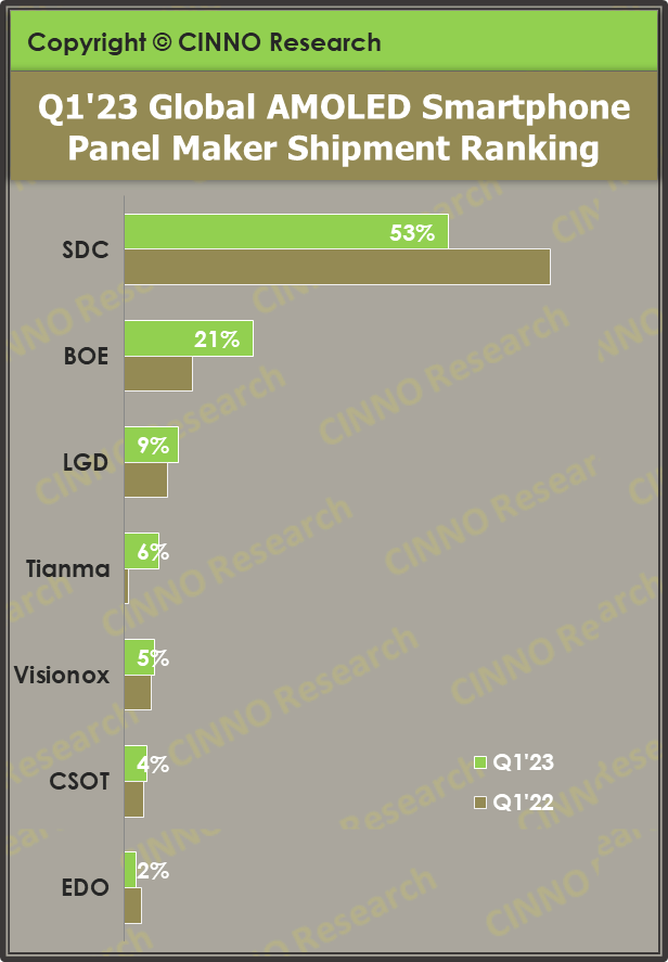 三星顯示(SDC)AMOLED智能手機(jī)面板出貨量約0.7億片,同比下滑32.7%,市場份額由去年同期的70.2%縮窄至53.3%,份額下降近兩成,主要因國內(nèi)柔性AMOLED面板廠持續(xù)以激進(jìn)的價(jià)格搶占訂單,三星剛性和柔性面板的需求都遭受較大沖擊,尤其在中國市場出貨量銳減;