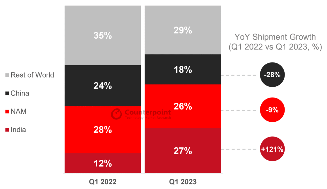 華為是最具影響力的中國 OEM,其在中國市場的出貨量同比下降 14%,不過在印度、拉丁美洲和中東和非洲的出貨量有所增加,將其全球出貨量的整體降幅限制在 9%。