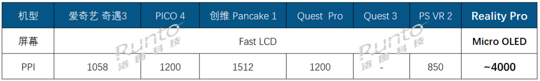 顯示方面,Reality Pro配有三個(gè)模塊,包括兩個(gè)索尼提供的1.4英寸4K Micro OLED顯示面板,峰值亮度達(dá)到截至目前的最高水平,超過5000 尼特,分辨率高達(dá)4000 PPI;以及一個(gè)由LGD提供的AMOLED面板,將用于實(shí)現(xiàn)低分辨率外圍視覺,從而增加視覺縱深。這已經(jīng)是目前市場(chǎng)上分辨率最高的顯示屏配置。