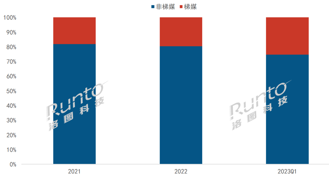 2023年第一季度,中國辦公樓+商品住宅+商業營業用現房的銷售面積同比增長22%?,F房銷售的增長,主要是因為自2022年第四季度開始,全國各地不斷出臺放寬人才政策、降首付、降利率、提高公積金額等寬松政策,促進了購房意愿。同時,第一季度全國電梯采購同比增長27%,戶內數字標牌中梯媒的需求也在第一季度有一部分的釋放,出貨量為3.1萬臺,同比增長5.4%。2023年第一季度,非梯媒的出貨量為9.1萬臺,同比下降15.3%。戶內數字標牌中,非梯媒的出貨量占比達74.6%。