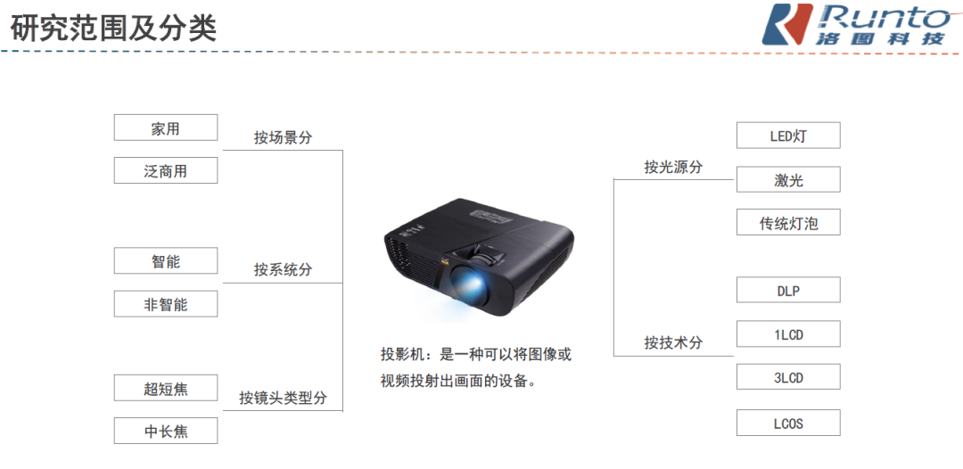 洛圖科技(RUNTO)將投影機按系統分為智能和非智能,按技術分為DLP、LCD和LCOS,按場景分為家用和泛商用,按光源分為LED、汞燈和激光。