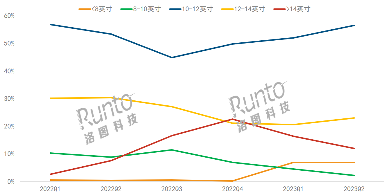 根據(jù)洛圖科技(RUNTO)線上監(jiān)測數(shù)據(jù)顯示,到 2023年第2季度,10-12英寸產(chǎn)品仍然為學習平板市場的第一尺寸段,且從去年第3季度開始,份額穩(wěn)定提升。