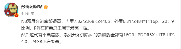 該博主爆料稱,OPPO Find N3折疊屏手機的雙屏分辨率都很高,配備7.82英寸內屏(分辨率為2268×2440p)和6.31英寸外屏(2484*1116p),屏幕比例為20:9,PPI(像素密度)在折疊屏里屬于“最高一檔”。