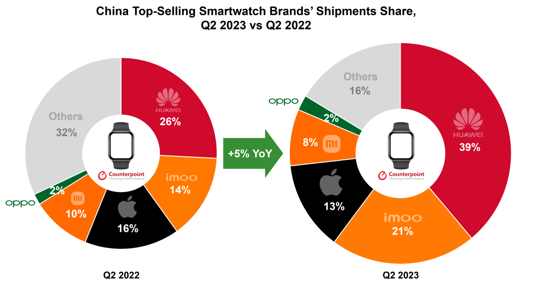 華為實現(xiàn)了58%的同比增長。該品牌在消費者中保持著良好的聲譽。在2023年第二季度,新推出的Huawei Watch 4和Huawei Watch 4 Pro系列機型受到消費者的歡迎,同時Huawei Watch GT3系列等老產(chǎn)品仍然銷售良好。新推出的Huawei Watch Ultimate也為華為在超高端領(lǐng)域的表現(xiàn)做出了貢獻。