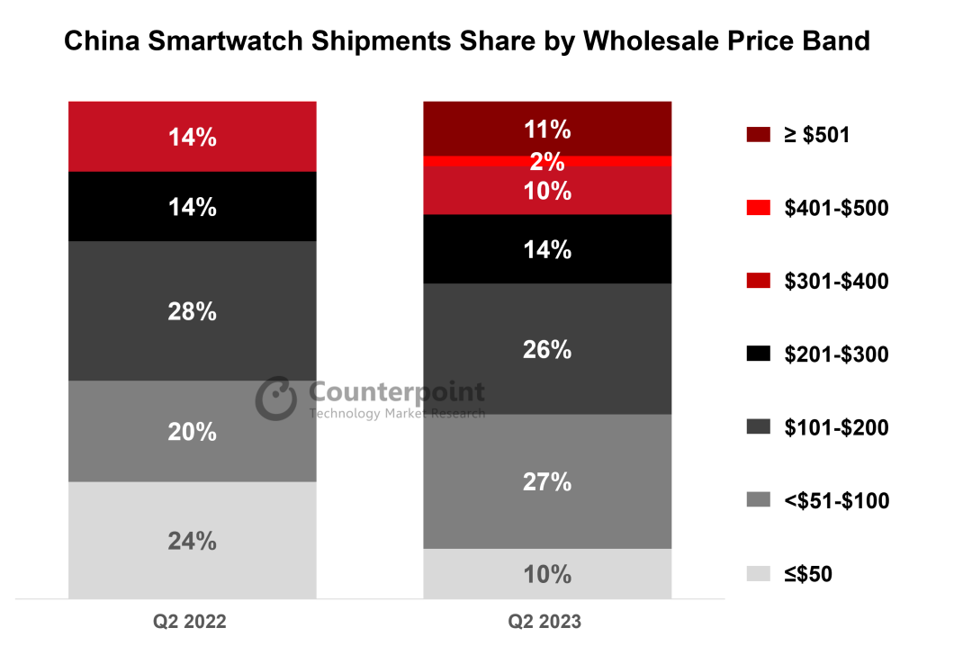 對此,研究分析師Alicia Gong評論說:“只有簡單功能的入門級產(chǎn)品不再像以往那樣受消費者的歡迎。越來越多的消費者正被更智能的機型所吸引,這些設(shè)備具有更精確的健康監(jiān)測、更多的運動追蹤和指導(dǎo)功能。自去年Apple Watch Ultra發(fā)布以來,高端市場的份額一直在增長。618電商節(jié)期間的促銷活動也促進了該價位段的增長。”