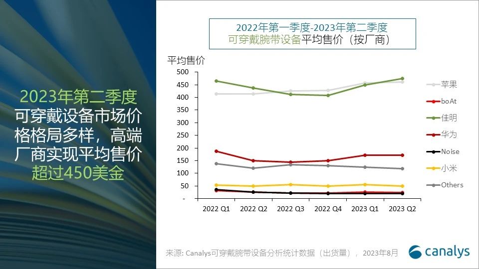 盡管與去年同期相比有所下降,但基礎(chǔ)手環(huán)市場仍然保持穩(wěn)定的市場份額,約為19%,主要?dú)w功于其親民的價格以及消費(fèi)者對價位較高的替代品仍持謹(jǐn)慎態(tài)度。手表類別實(shí)現(xiàn)兩位數(shù)增長,主要是由性價比較高的基礎(chǔ)手表推動。2023年第二季度,廠商推出一系列新品,以增強(qiáng)市場份額。例如,小米和華為推出了價格實(shí)惠的基礎(chǔ)手環(huán)和手表,滿足各類消費(fèi)者的偏好。印度廠商也效仿而行,像Noise這樣的品牌推出入門級型號,同時還推出多種價位段的產(chǎn)品,以滿足更多的客戶群。Fire Boltt進(jìn)一步降價,以低于19美元的平均售價為消費(fèi)者提供卓越的用戶體驗(yàn)。