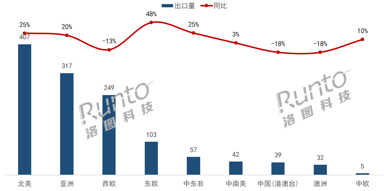 向西歐地區的出口量占比為20%,同比下降13%。對東歐地區的出口量份額為8.3%,同比大漲48%,特別地,對俄羅斯、白俄羅斯的出口量同比分別大漲107%、1783%。