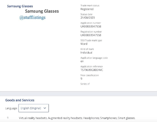 商標(biāo)信息顯示,“Samsung Glasses”商標(biāo)于 2021 年 8 月 21 日提交,申請?zhí)枮?UK00003947958,尼斯分類第 9 類,商品和服務(wù)指出“虛擬現(xiàn)實頭顯;增強現(xiàn)實頭顯;智能眼鏡”。