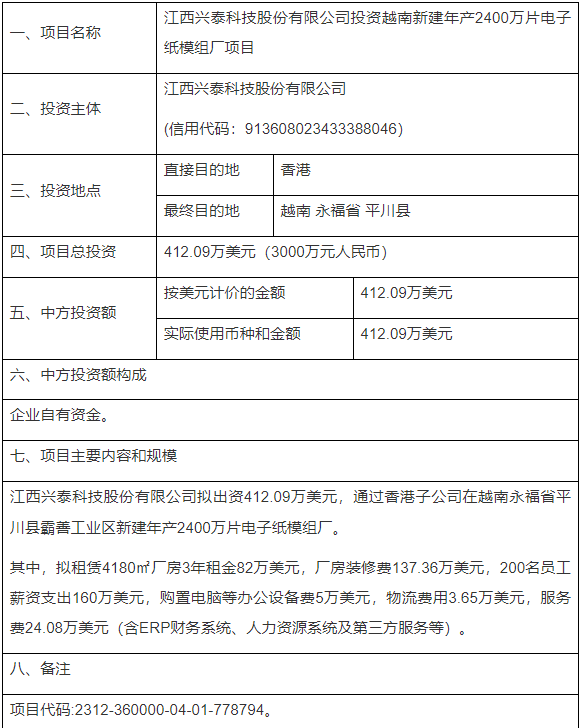 江西興泰科技股份有限公司擬出資412.09萬美元,通過香港子公司在越南永福省平川縣霸善工業(yè)區(qū)新建年產(chǎn)2400萬片電子紙模組廠。其中,擬租賃4180㎡廠房3年租金82萬美元,廠房裝修費(fèi)137.36萬美元,200名員工薪資支出160萬美元,購置電腦等辦公設(shè)備費(fèi)5萬美元,物流費(fèi)用3.65萬美元,服務(wù)費(fèi)24.08萬美元(含ERP財務(wù)系統(tǒng)、人力資源系統(tǒng)及第三方服務(wù)等)。