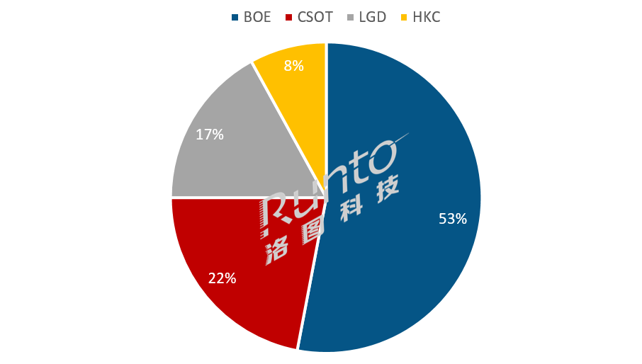 在大陸系面板廠中,BOE(京東方)出貨量同比增長(zhǎng)了24%,占比42.4%,同比增長(zhǎng)9.5個(gè)百分點(diǎn);CSOT(華星光電)出貨量同比增長(zhǎng)了7%,占比40.1%,同比增長(zhǎng)近4個(gè)百分點(diǎn);HKC(惠科)則占比為2.7%。