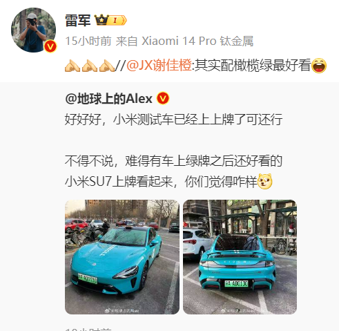 1月29日,小米董事長兼CEO雷軍表示,小米汽車投放了多批測試車參與路測,之前都是帶偽裝的,發(fā)布會后才投放無偽裝版。隨后有網(wǎng)友曬出了無偽裝且上牌的小米SU 7照片,根據(jù)網(wǎng)友披露信息,其中一輛已上牌測試車的車牌號為“京A·AD0130”,雷軍同步轉(zhuǎn)發(fā)了這則消息。