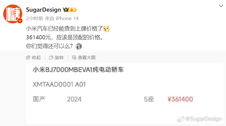 集微網(wǎng)消息,1月30日,有網(wǎng)友曬出小米汽車保單,根據(jù)保單顯示,小米SU 7頂配版(小米BJ7000MBVA1)價格為36.14萬元。