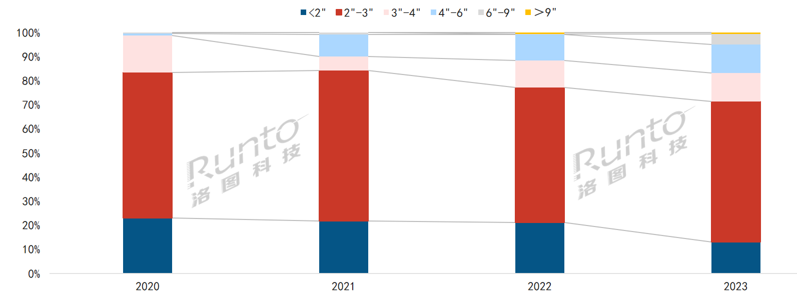 標(biāo)簽尺寸方面,3寸以上產(chǎn)品增幅明顯。整體來看,電子紙標(biāo)簽仍然以小尺寸為主流,2-3寸的尺寸區(qū)間的市場份額達(dá)到了58.3%,該尺寸段是匹配貨架間隔最合適的尺寸段,未來仍將持續(xù)保持這個(gè)占比水準(zhǔn)。3寸以上標(biāo)簽的應(yīng)用也在加快,市場份額逐年提升,2023年達(dá)到了28.8%,較2022年提升了5.8個(gè)百分點(diǎn)。