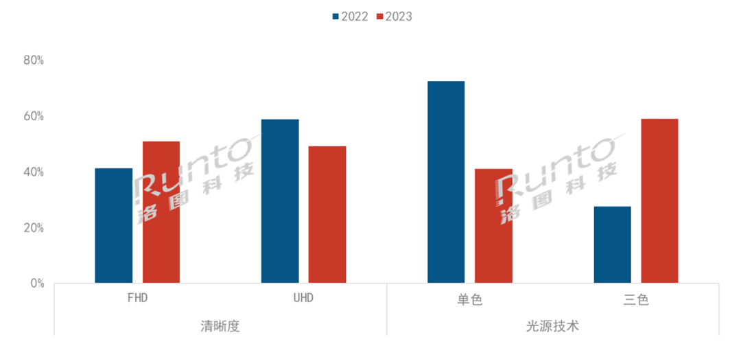 根據(jù)洛圖科技(RUNTO)數(shù)據(jù)顯示,2023年,三色激光技術(shù)產(chǎn)品滲透率接近60%,較同期增長(zhǎng)32個(gè)百分點(diǎn)。在堅(jiān)果、當(dāng)貝、Vidda等品牌的帶動(dòng)下,三色激光技術(shù)實(shí)現(xiàn)了對(duì)單色的反超。