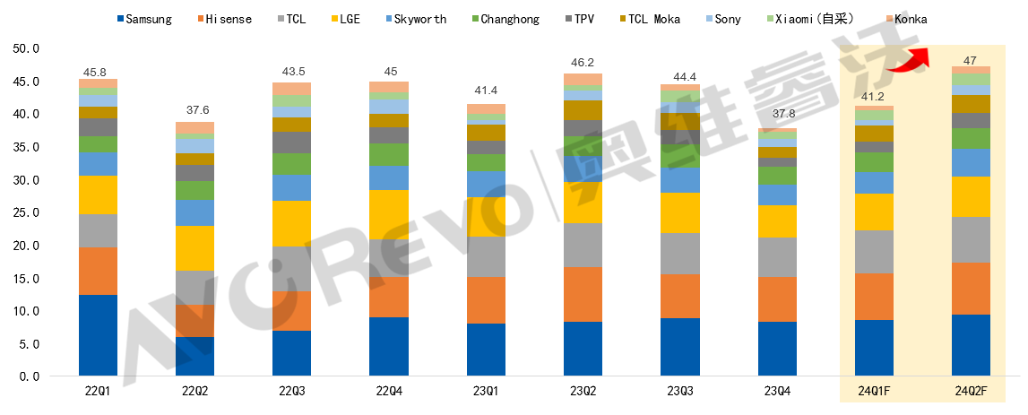 因為大陸面板廠基本都踐行按照大部分產線休假2周的策略來執行,在這期間銷售、物流和工廠人員都放假,導致生產和出貨都短暫停歇,面板廠出貨計劃大幅削減,根據奧維睿沃(AVC Revo)《AVC產業鏈-全球電視面板產銷存月度報告》,2月全球電視面板出貨計劃16M,遠低于2023年1月同樣因為大幅減產的出貨低點,面板廠控制出貨節奏,造成市場供不應求,整機廠訂單被延后至3月份滿足。3月份面板廠稼動率提升,出貨計劃逐漸恢復。