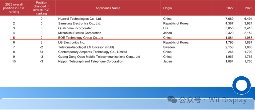 世界知識產權組織(WIPO)這個月7日發布數據表示,2023年中國申請專利的數目雖有減少,但仍是申請專利最國的國家。其中,華為的申請量也有大幅減少,但依然高達6千多件,仍然是全球申請專利最多的企業。BOE(京東方)以1988件PCT專利申請量位列全球第5,成為榜單前五名中唯一的半導體顯示企業。這已是京東方連續8年進入全球PCT專利申請TOP10。