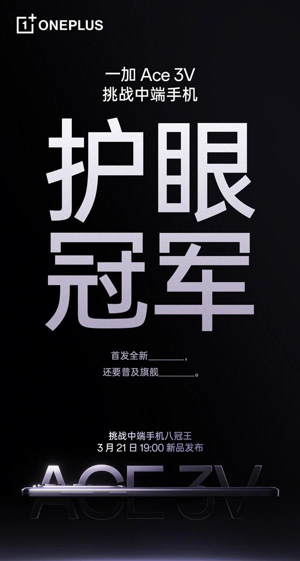 3月20日消息,一加李杰宣布,一加即將推出的Ace 3V旨在挑戰中端手機市場的護眼冠軍地位。
