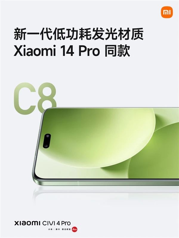 小米官方宣布小米Civi 4 Pro搭載了小米14 Pro同款的新一代C8發(fā)光材料,峰值亮度達到了3000尼特。