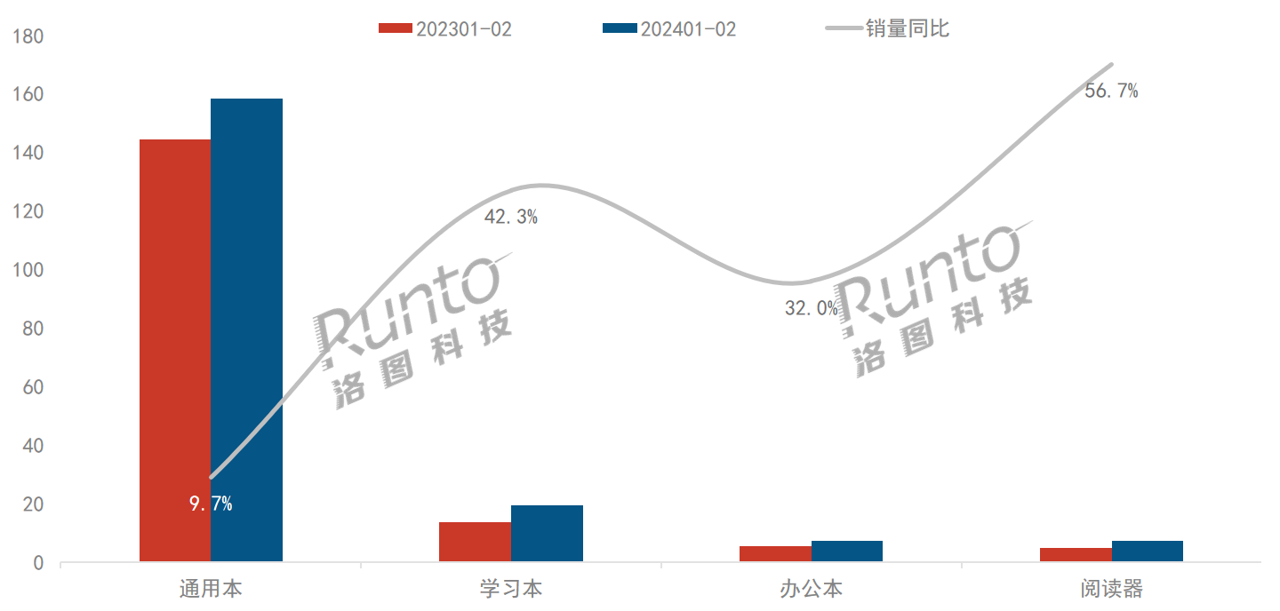 根據洛圖科技(RUNTO)線上監測數據顯示,2024年1-2月,通用型平板占比82.3%,銷量同比增長9.7%。