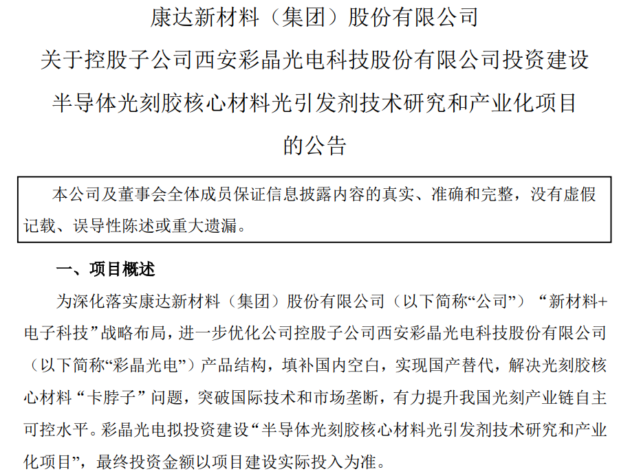 4月15日晚間,康達新材發布子公司投資建設半導體光刻膠核心材料光引發劑技術研究和產業化項目公告。