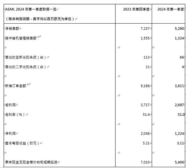 4月17日,荷蘭光刻機公司阿斯麥(ASML)發布2024年第一季度財報。財報數據顯示,2024年第一季度,ASML實現凈銷售額53億歐元,環比下降27%,毛利率為51.0%,凈利潤為12億歐元,環比下降40%。