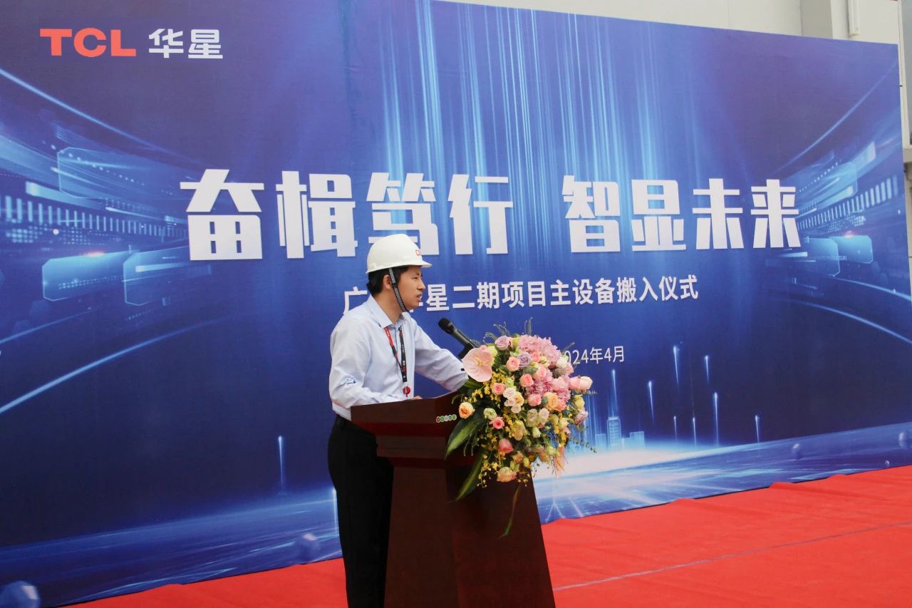 2024年4月18日,廣州華星(以下簡稱”t9項目“)首臺曝光機設備搬入儀式成功舉辦。本次儀式以“奮楫篤行  智顯未來”為主題,廣州華星副總裁鄧總、廣州基地總經理張總、廠務中心總監吳總、t9面板廠廠長康廠、t9模組廠廠長海廠、曝光機廠商營業部副部長山本雅樹以及其他友商合作伙伴代表出席本次儀式,共同見證這一里程碑時刻。