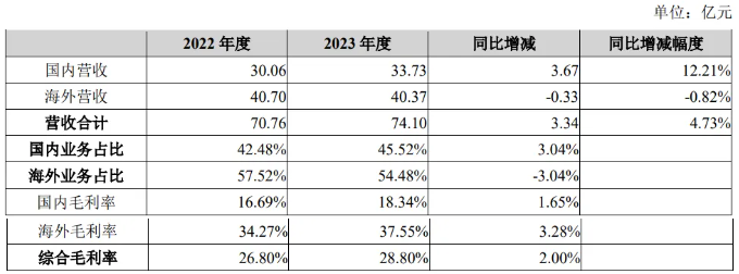 2023 年度,公司實現毛利率 28.80%,國內外業務毛利率同比均有所改善,主要得益于公司連續多年在國際市場的深耕、渠道的提前布局及品牌優勢,公司產品及解決方案的附加值逐漸體現。