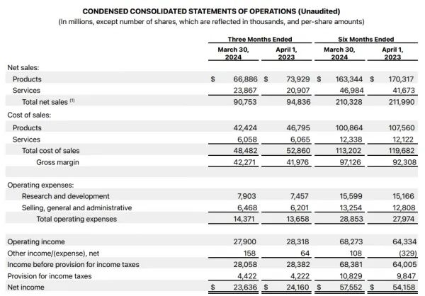 在截至2024年3月30日的第二財季,蘋果公司的凈利潤為236.36億美元,與去年同期的241.60億美元相比下降2%;每股攤薄收益為1.53美元,與去年同期的1.52美元相比略有增長。蘋果公司第二財季用于計算每股收益的在外流通股票總量為15464709股,而去年同期為15847050股。