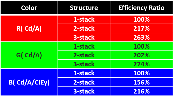 和輝光電單層和三層串聯(lián)疊構(gòu)OLED器件顯示對(duì)比