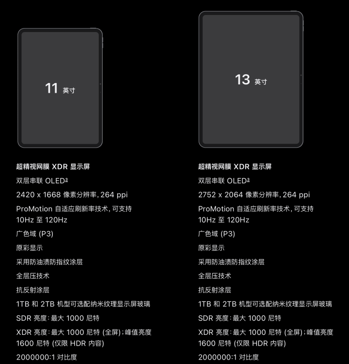 為了在大屏顯示屏上提供極高的亮度,iPad Pro 采用了雙層 OLED (Tandem OLED)設計,兩層 OLED 面板的光線經過疊加融合,實現了最大 1000 尼特的 SDR 亮度與最大 1600 尼特的 HDR 亮度。