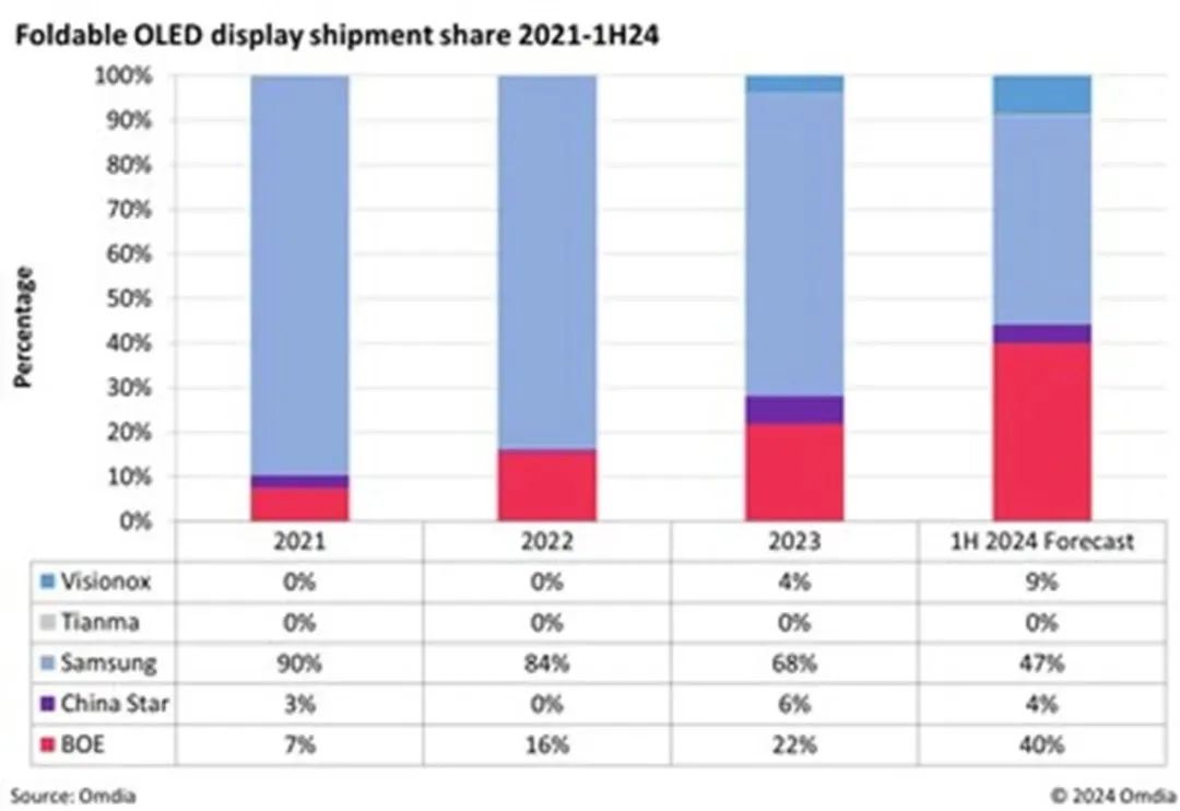 中國大陸柔性O(shè)LED顯示面板廠商技術(shù)飛速發(fā)展對三星顯示的市場主導(dǎo)地位構(gòu)成重大威脅。2024年上半年,中國可折疊OLED出貨量預(yù)計將達到640萬臺,超過三星顯示在韓國出產(chǎn)的570萬臺。 根據(jù)Omdia《智能手機顯示面板情報服務(wù)》的數(shù)據(jù),在此期間,中國制造的可折疊OLED預(yù)計將占可折疊OLED總出貨量的53%。