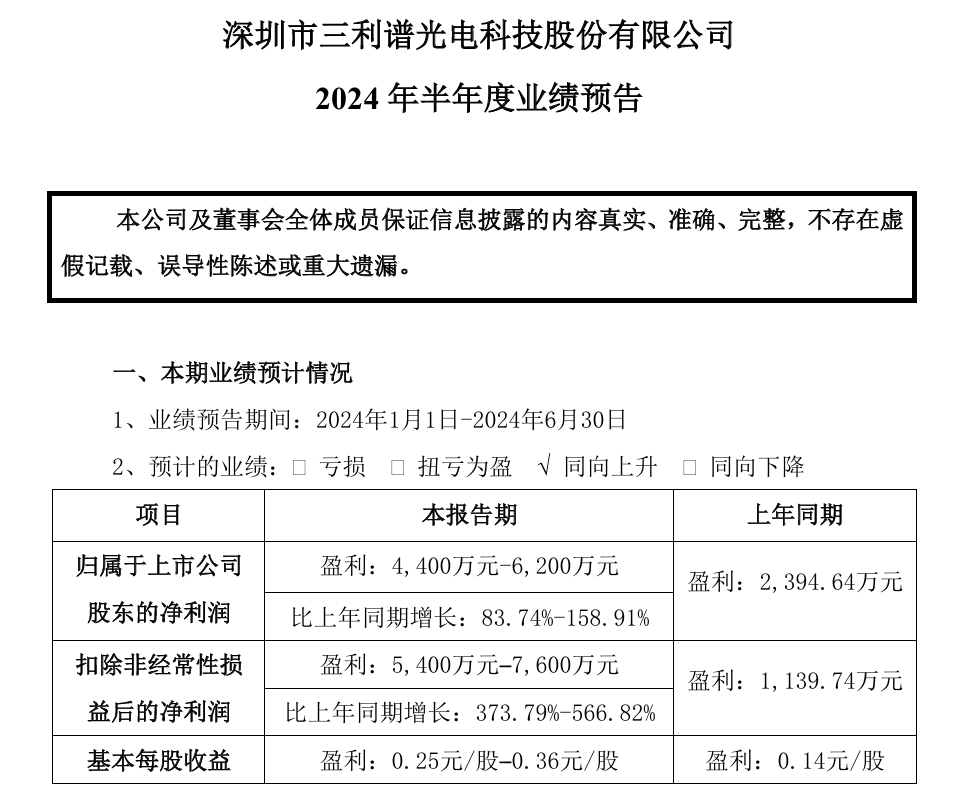 7月10日晚間,三利譜公告,預(yù)計公司2024年上半年實現(xiàn)歸屬于上市公司股東的凈利潤4400萬元至6200萬元,較上年同期2394.64萬元增長83.74%-158.91%;預(yù)計實現(xiàn)扣除非經(jīng)常性損益后的凈利潤5400萬元至7600萬元,較上年同期1139.74萬元增長373.79%-566.82%。