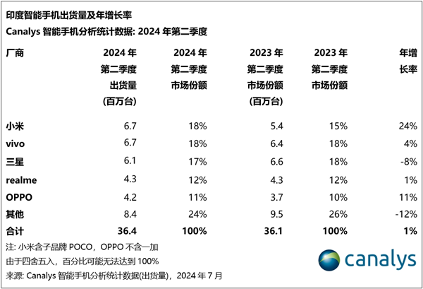 今日,分析機構Canalys發布報告稱,2024年第二季度,在季節性需求低迷以及部分地區極端天氣等各種因素的影響下,印度智能手機市場微增1%,總出貨量達3640萬臺。