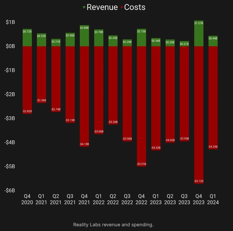 Reality Labs的支出中超過50%用于AR眼鏡的研發,這是Meta尚未推出的產品線。其余支出則用于Quest頭顯和Horizon軟件平臺,這兩項技術仍處于相對早期階段,與成熟階段相差甚遠。