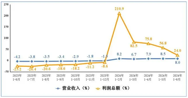 上半年,規模以上電子信息制造業實現營業收入7.37萬億元,同比增長8%,較1—5月份提高0.5個百分點;營業成本6.41萬億元,同比增長7.4%;實現利潤總額2942億元,同比增長24%;營業收入利潤率為3.99%,較1—5月份增加0.7個百分點。6月份,規模以上電子信息制造業營業收入1.41萬億元,同比增長5.6%。