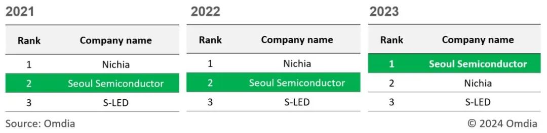 據(jù)市場追蹤機構Omdia的數(shù)據(jù),按銷售額計算,2023 年首爾半導體在背光市場領域的全球 LED 市場份額將達到 16.5%,已超越日本的日亞化工(Nichia),成為世界上最大的背光發(fā)光二極管(LED)顯示器制造商。