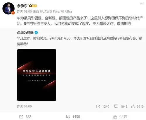 昨日華為官方宣布,華為品牌盛典及鴻蒙智行新品發(fā)布會(huì)將于9月10日舉行,屆時(shí)將發(fā)布全新的智能手機(jī)產(chǎn)品。